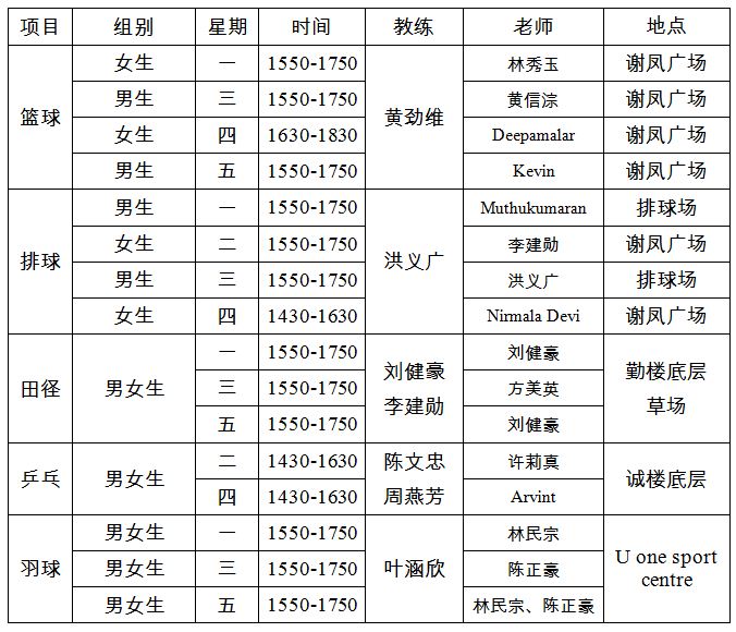 - 羽球队训练2018年调整为,至19.01.2018为每星期一、三、五都到校外场馆训练(校方只租借2个场地,球队可自行租借更多,唯需自行付费)。19.01.2018之后修改为每星期两次,其中一次到校外场馆,至到另行通知。