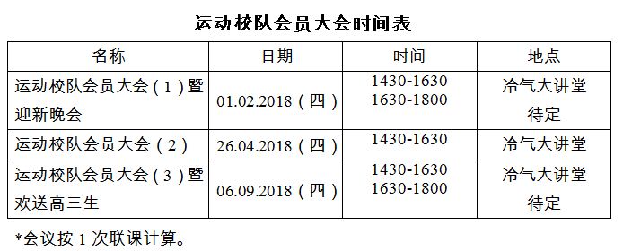 - 15.01.2018(一)-19.01.2018(五)新生选拔,照校队训练时间进行。