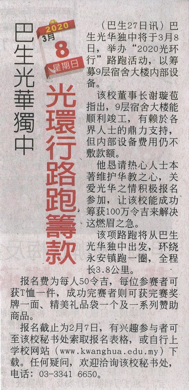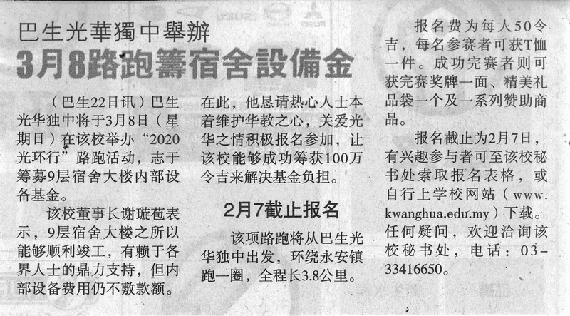 巴生光华独中举办3月8路跑筹宿舍设备金
