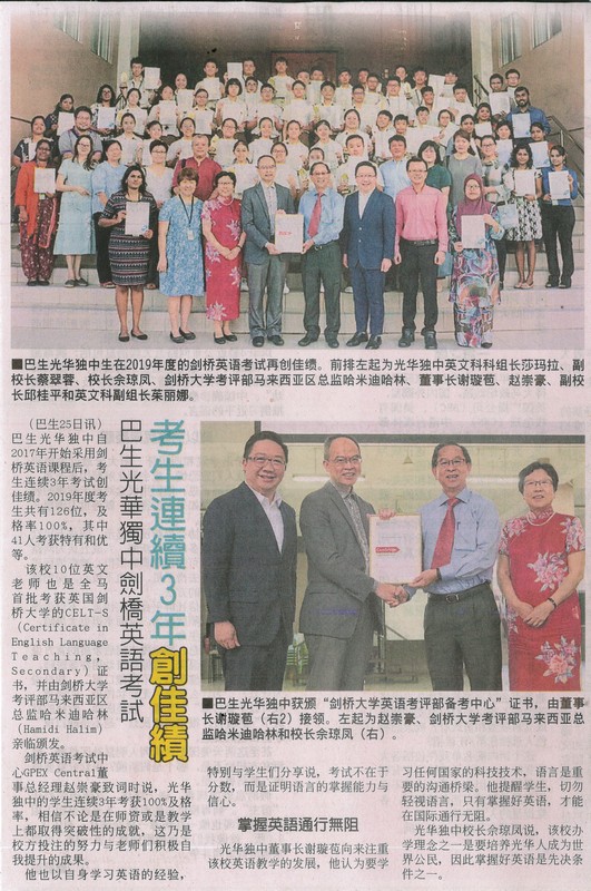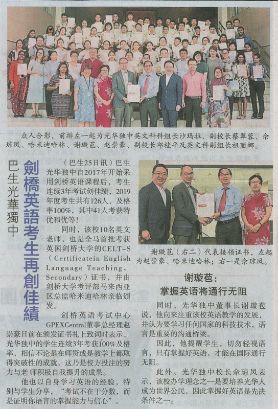巴生光华独中剑桥英语考生再创佳绩