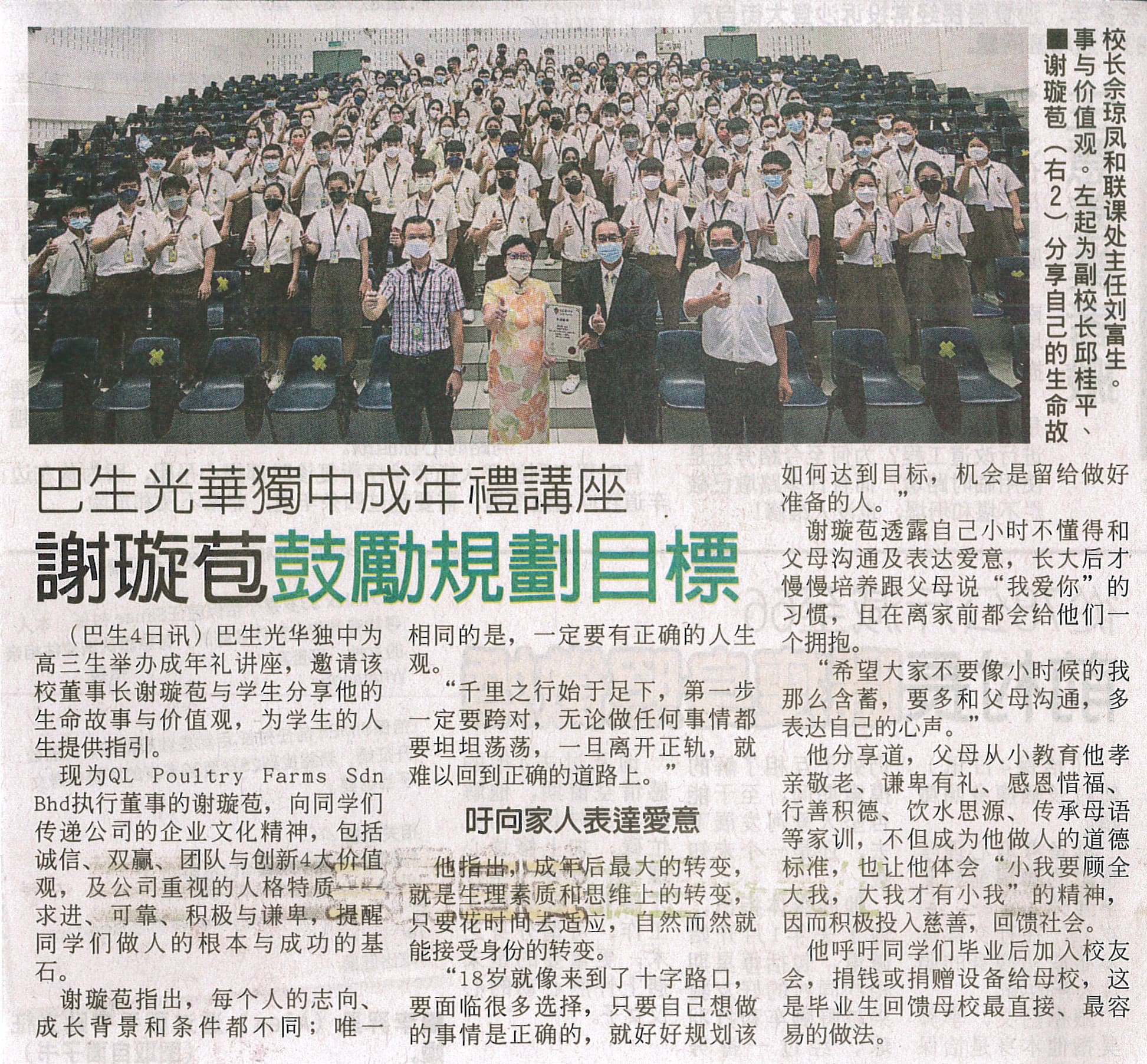 《中国报》本校举办成年礼讲座,谢璇苞董事长勉励学生坚守初心