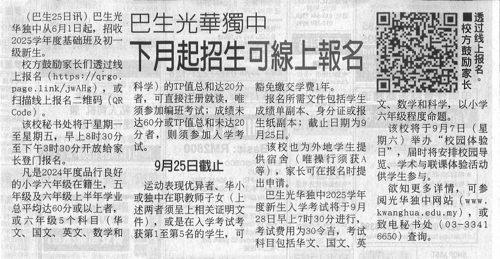 《中国报》巴生光华独中下月起招生可线上报名