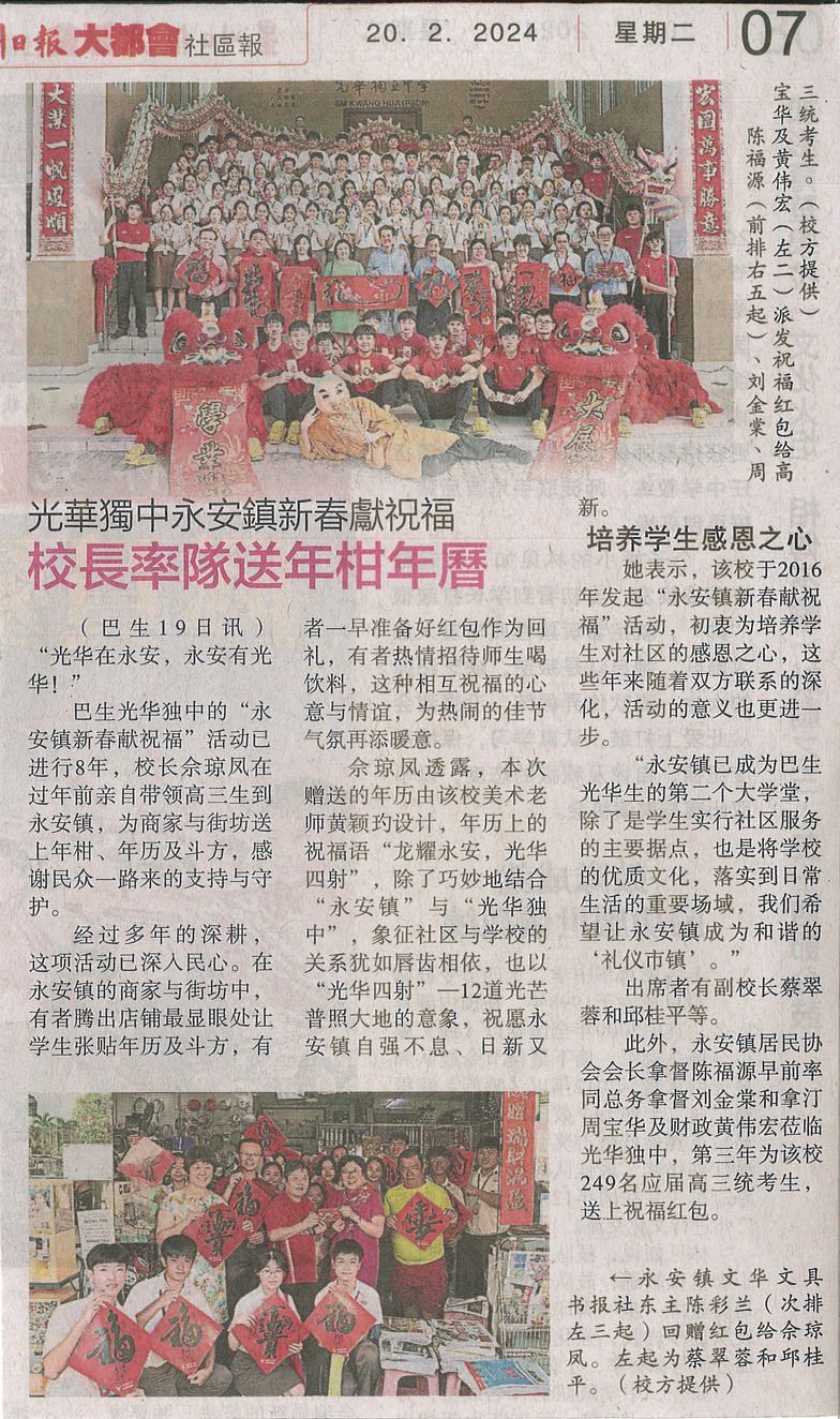 《星洲日报》光华独中永安镇新春献祝福 校长率队送年柑年历