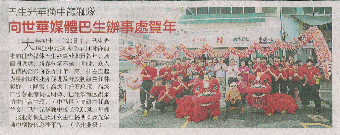 《星洲日报》巴生光华独中龙狮队向世华媒体巴生办事处贺年