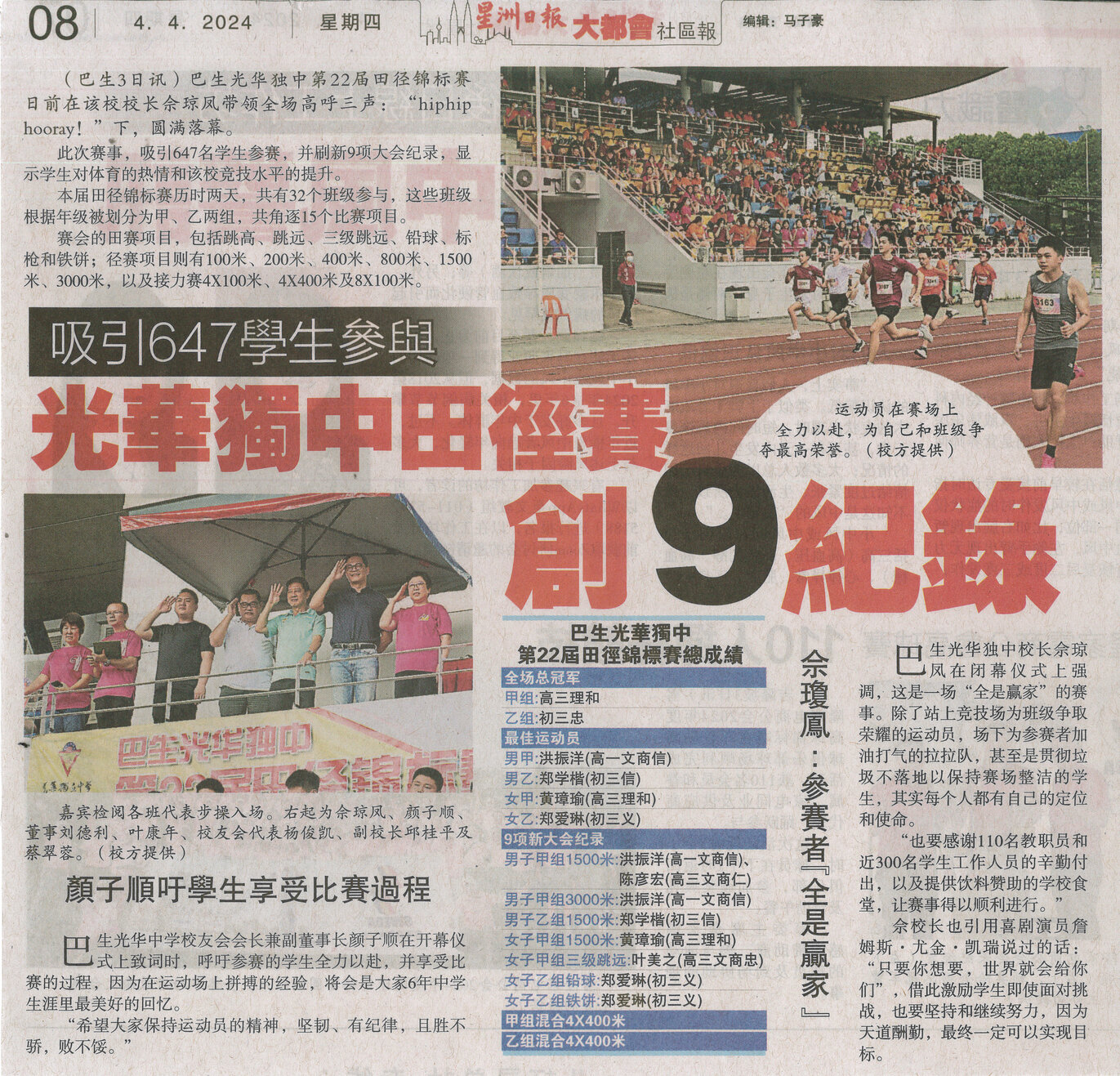 《星洲日报》吸引647学生参与 光华独中田径赛创9纪录
