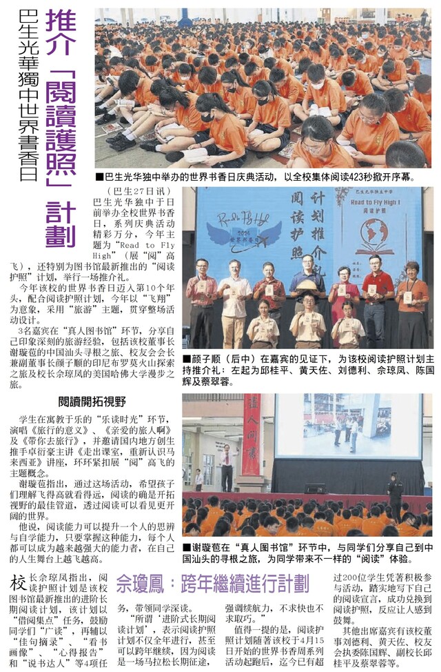 《中国报》巴生光华独中世界书香日推介“阅读护照”计划(电子报)