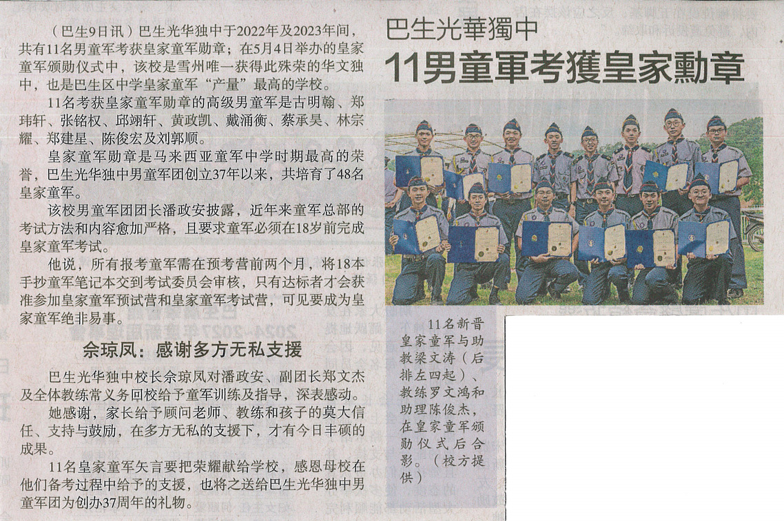 《星洲日报》巴生光华独中11男童军考获皇家勋章