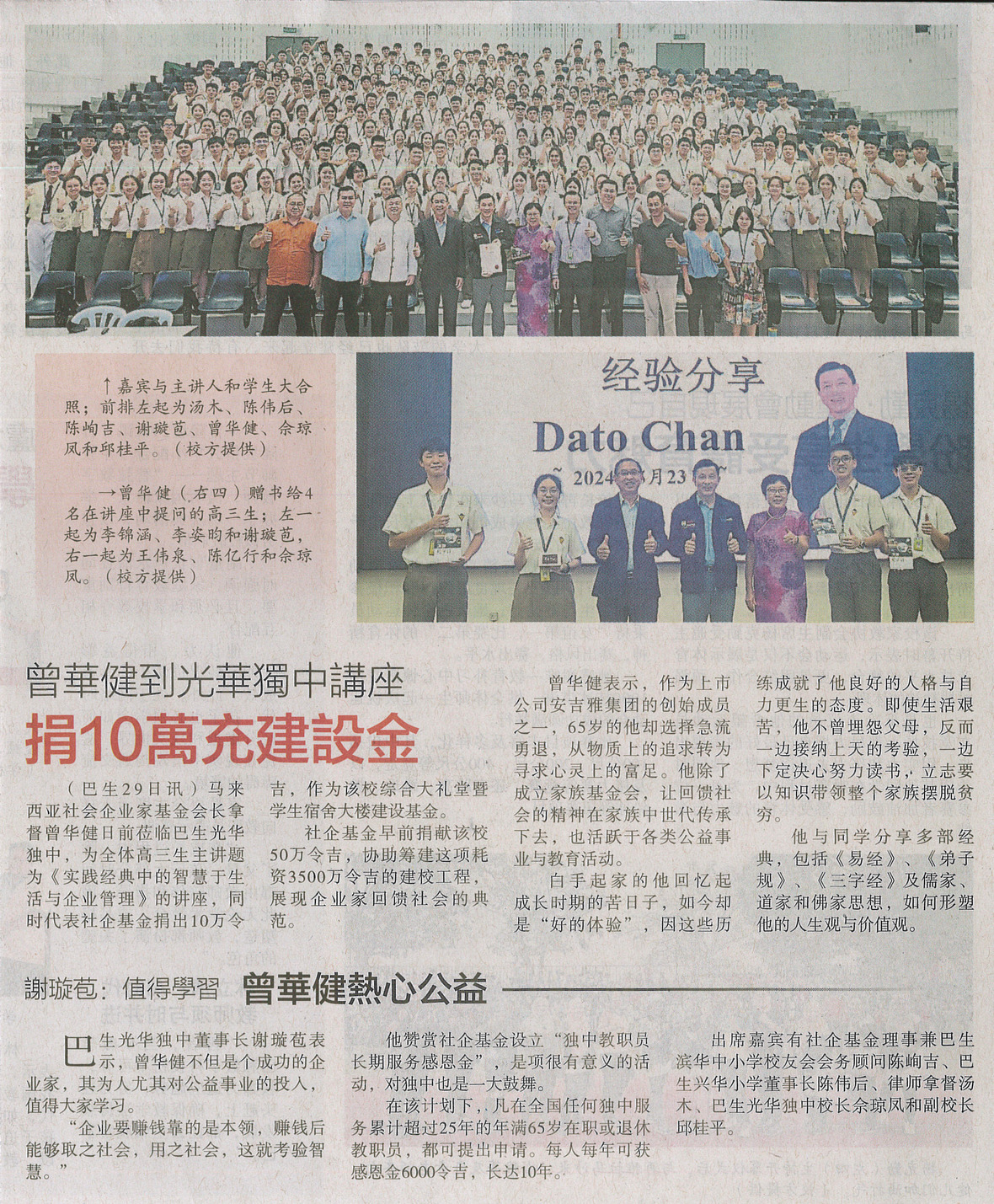 《星洲日报》曾华健到光华独中讲座 捐10万充建设金