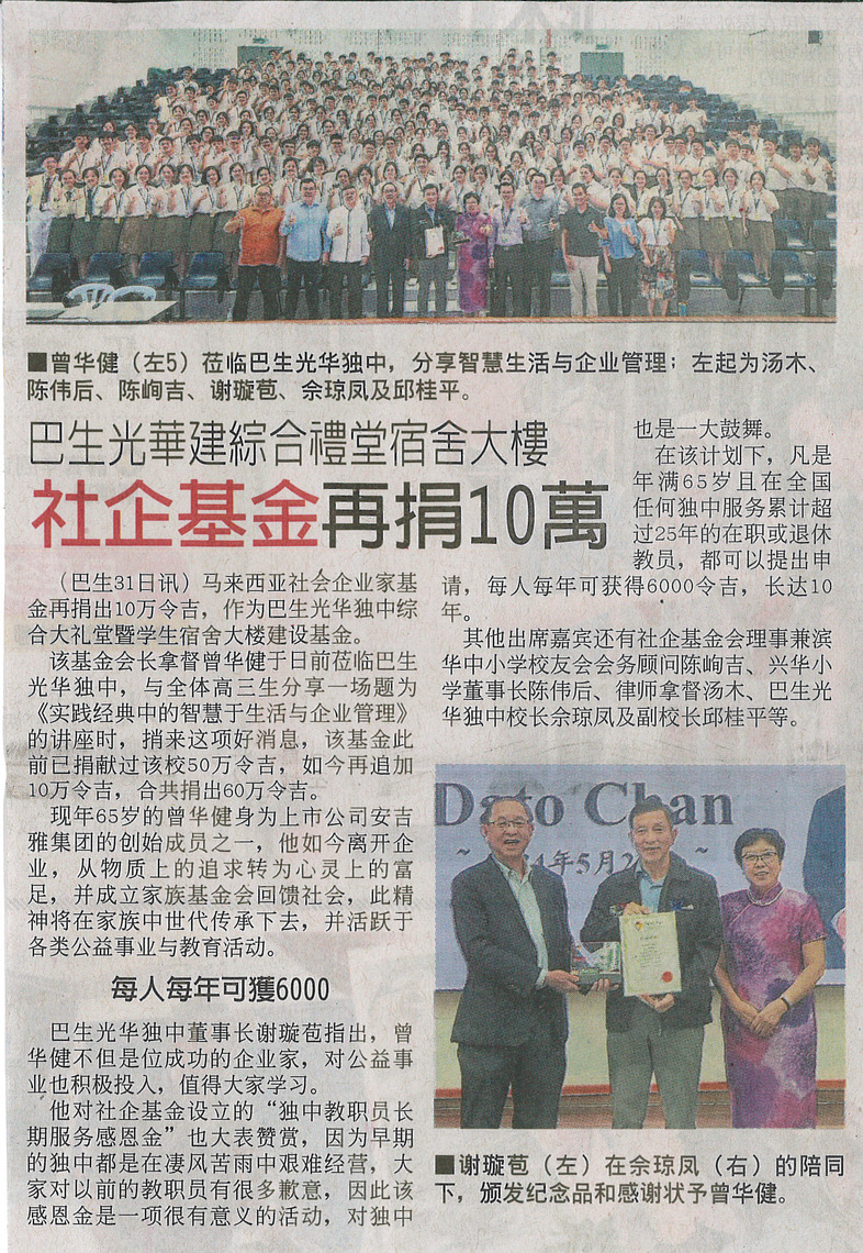 《中国报》巴生光华建综合礼堂宿舍大楼 社企基金再捐10万
