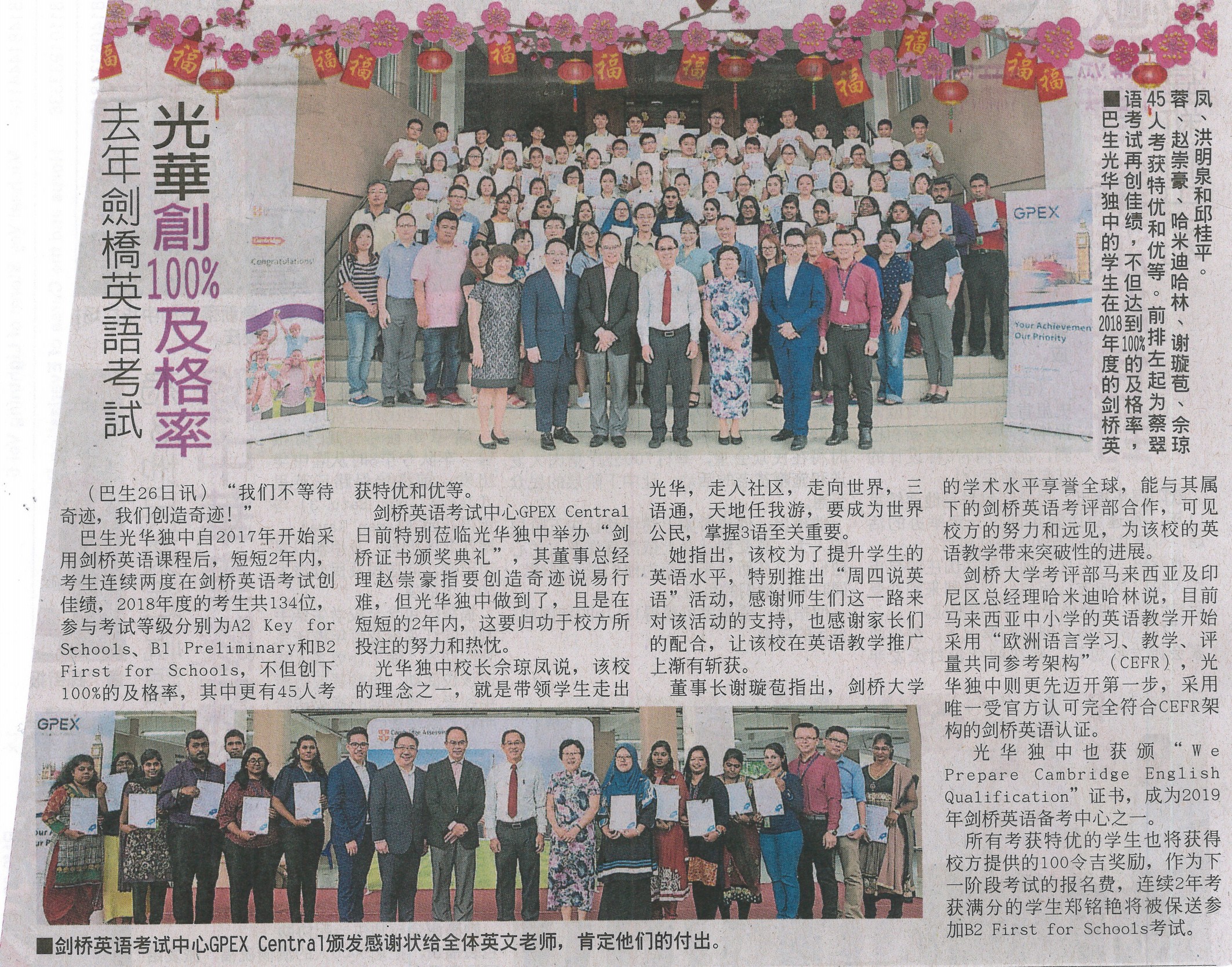 巴生光华独中去年剑桥英语考试光华创100%及格率
