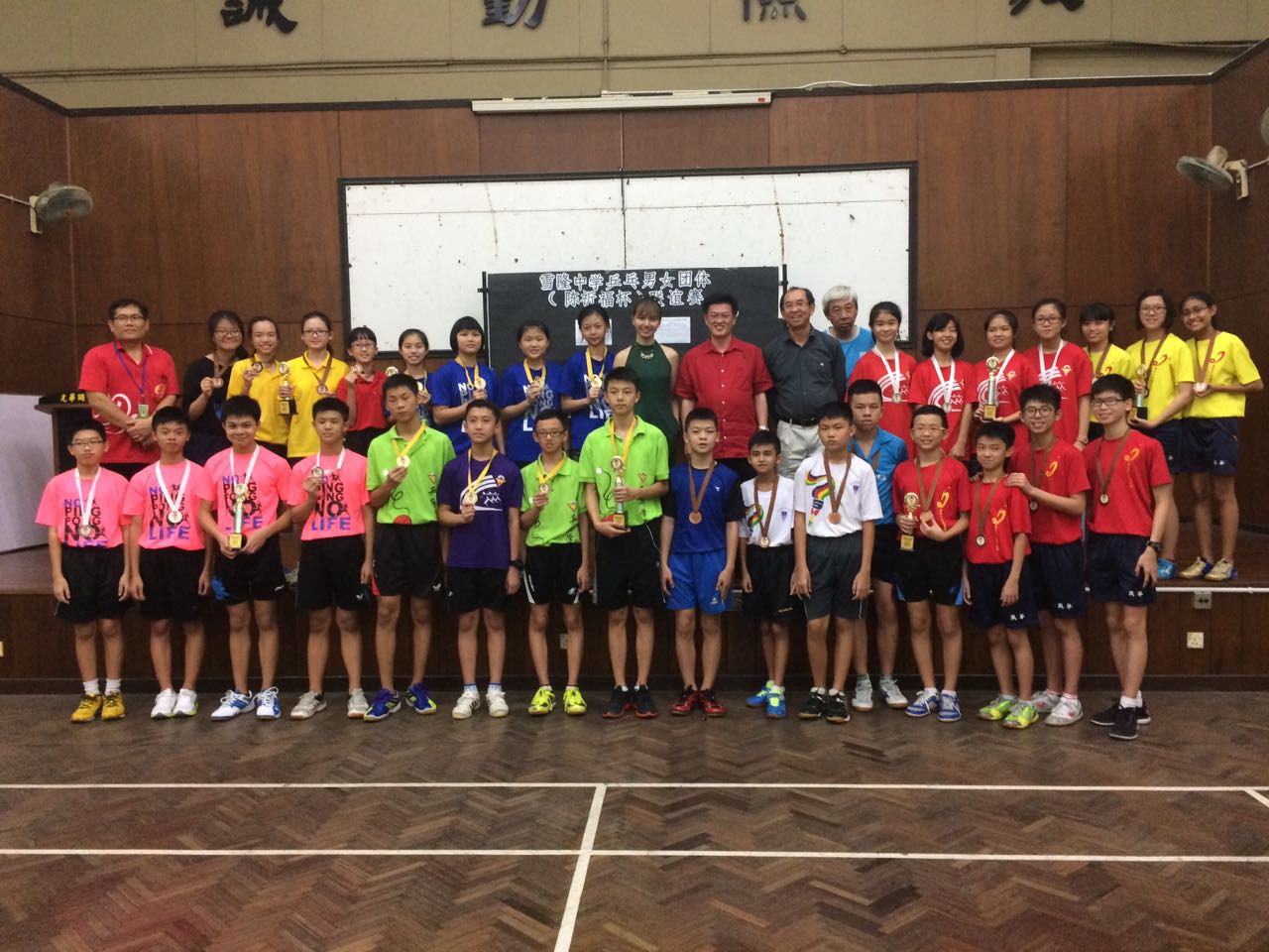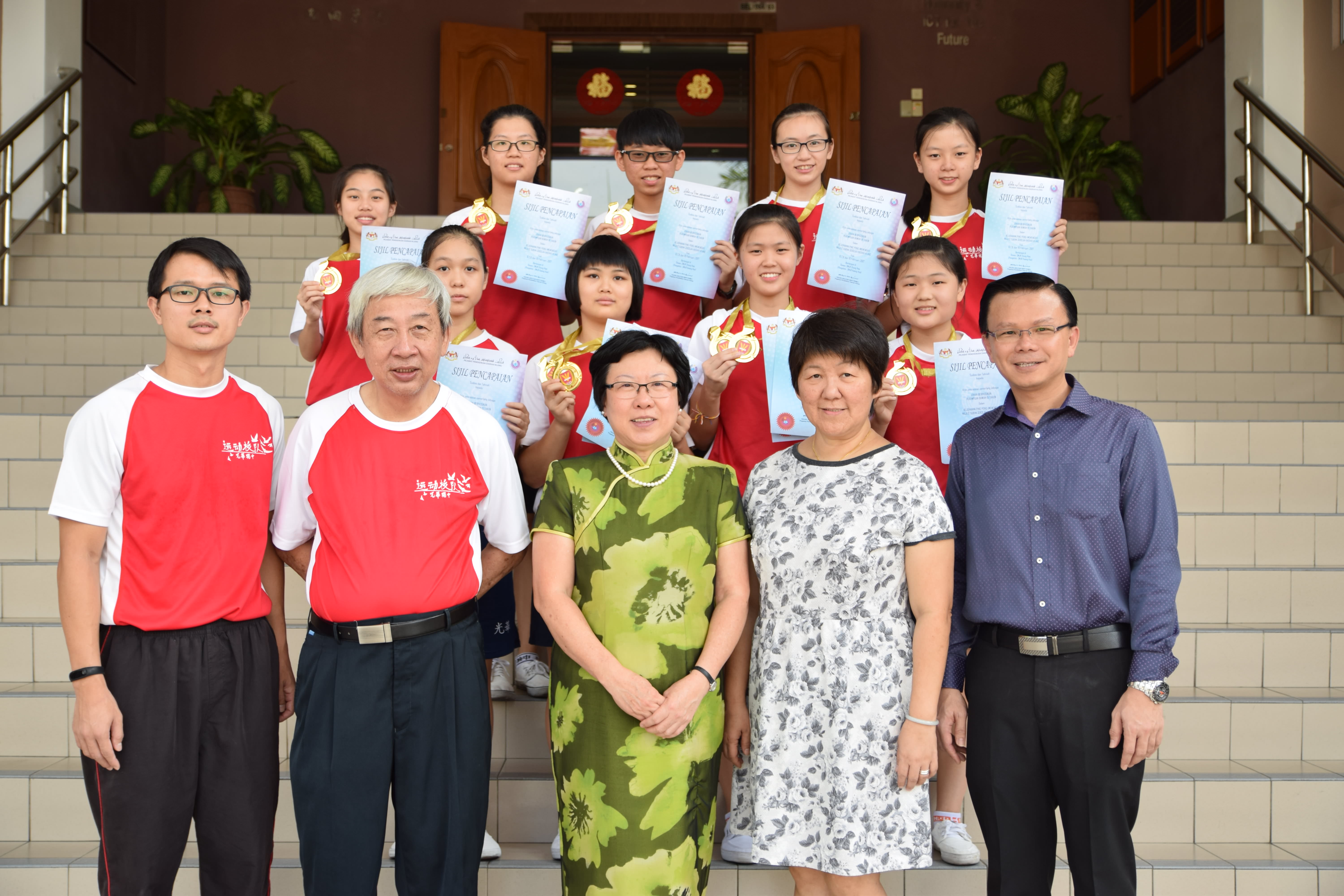 2017年雪隆中学乒乓团体(陈祈福杯)联谊赛优胜队伍与主办学校巴生光华独中教练陈文忠(后排右八起)、董事长谢璇苞和赞助人陈祈福合影。
