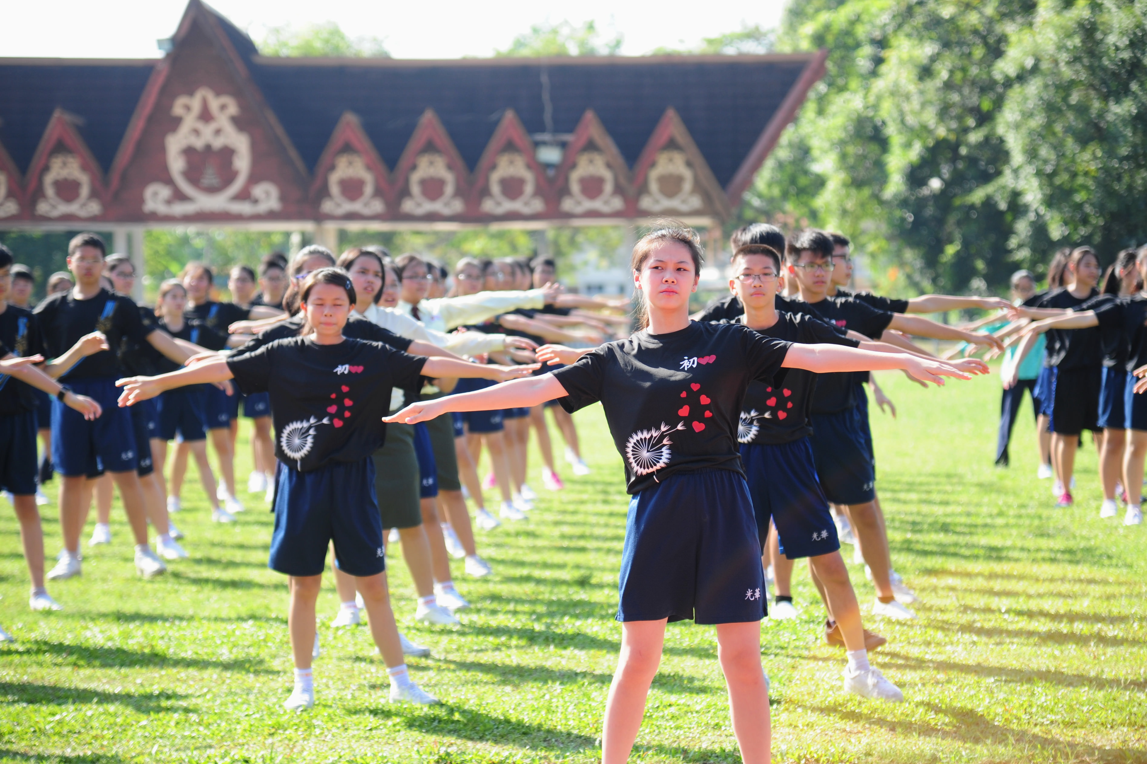 基础、初一和初二级的学生在开幕仪式上表演青春洋溢的第9套广播体操。