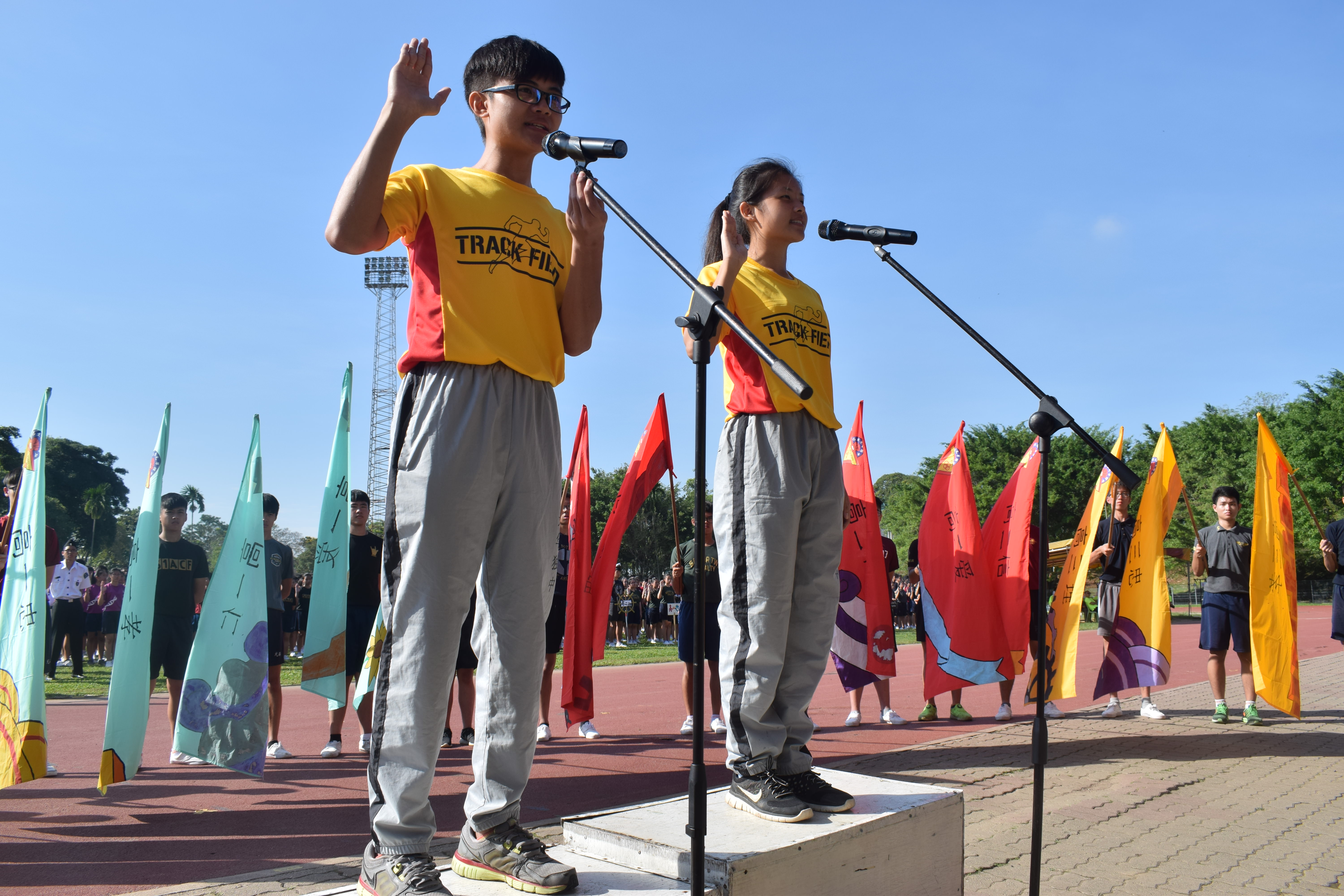 选手代表冯乐康(左)和李仪凤(右)带领全体运动员宣誓。