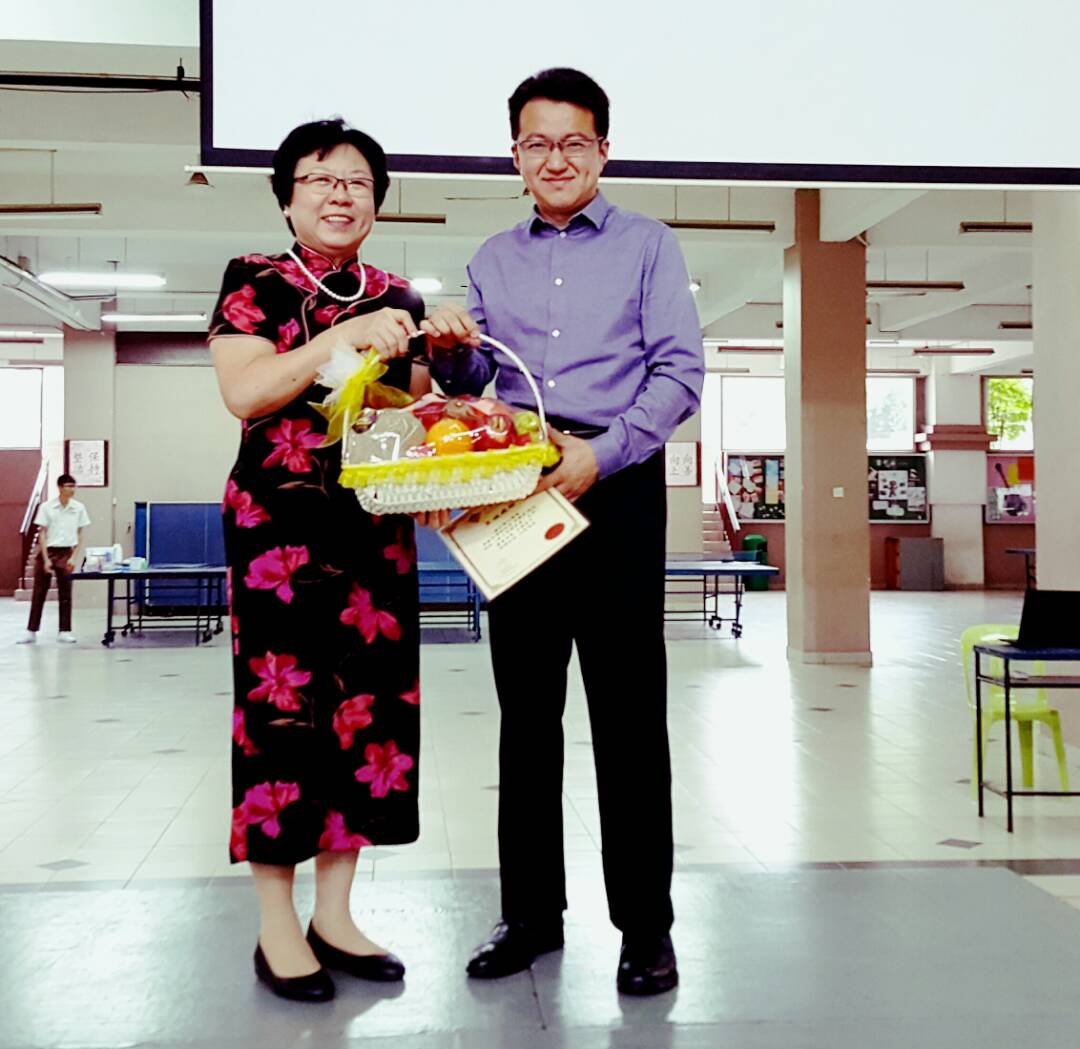 巴生光华独中校长佘琼凤(左)颁发纪念品予校友兼居銮区国会议员刘镇东(右),感谢他返回母校鼓励学弟妹们。
