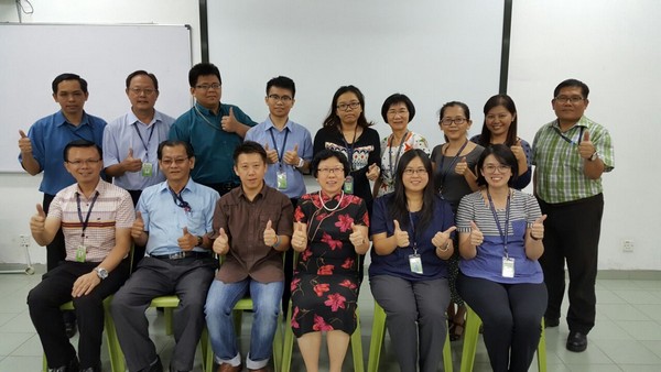 林汶良(前排左三)于讲座结束后,与本校数学老师进行交流;左起为本校副校长邱桂平、资深数学老师邱启进、校长佘琼凤、数学科副组长李佩芬、组长林艾嘉。