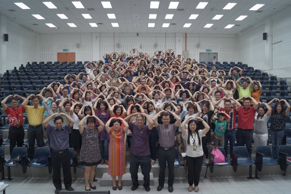 本校校长佘琼凤(前排左三)及主讲人卢水清(右三)在讲座结束后,带领出席的家长做出爱心手势,寓意用爱守护孩子;左二与右二分别为副校长蔡翠蓉和邱桂平。