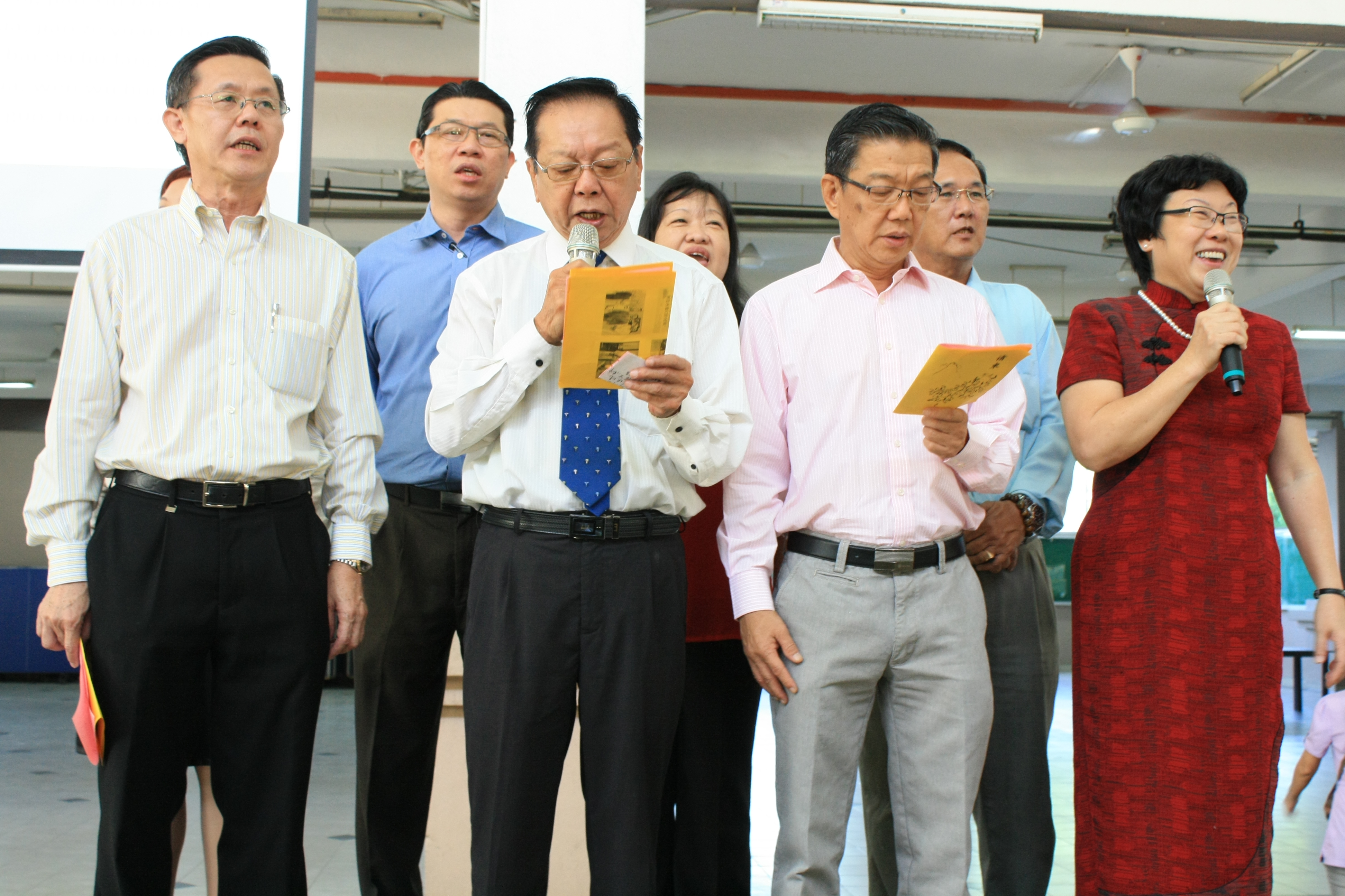 前辈带领学弟妹高歌校歌。前排左起为郑今智、黄华民、陈汶来及佘琼凤。