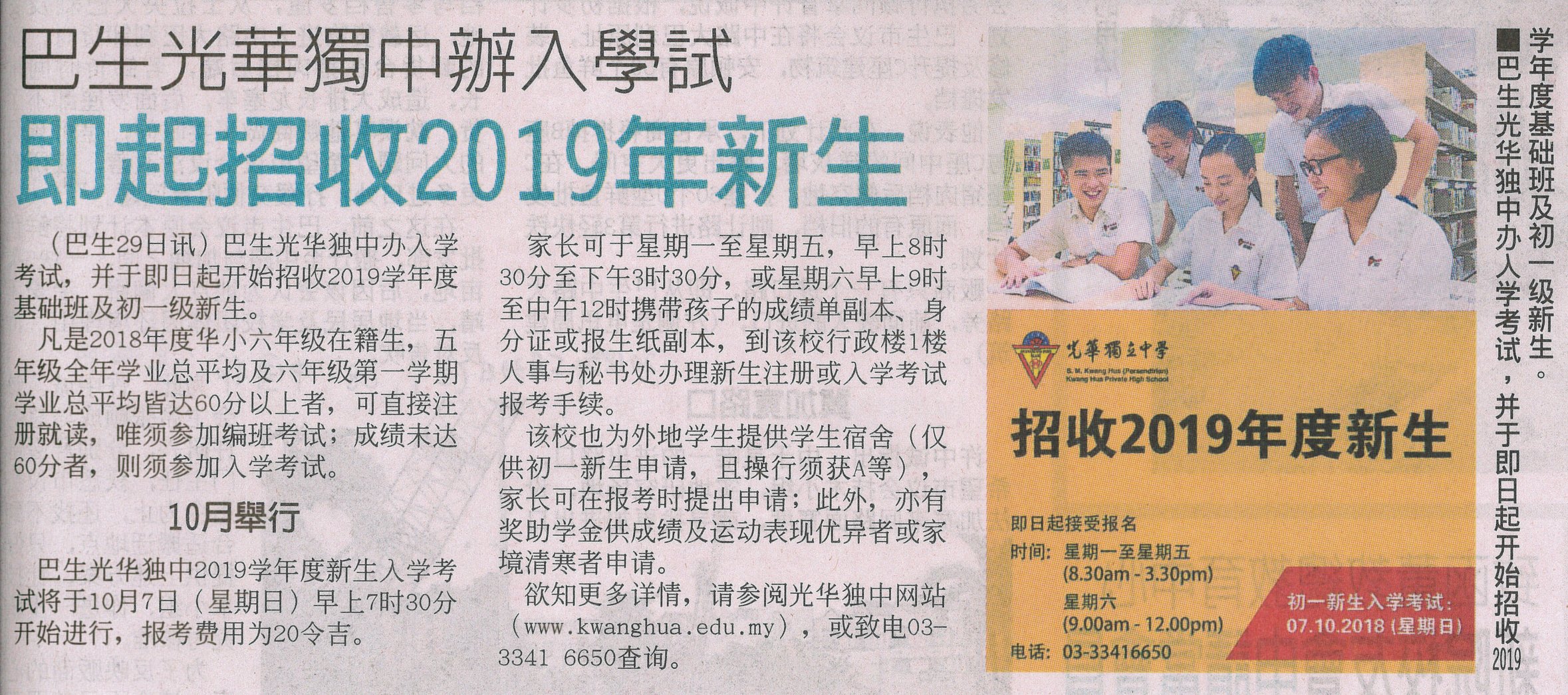 巴生光华独中办入学考试 即日起招收2019学年度新生_中国报