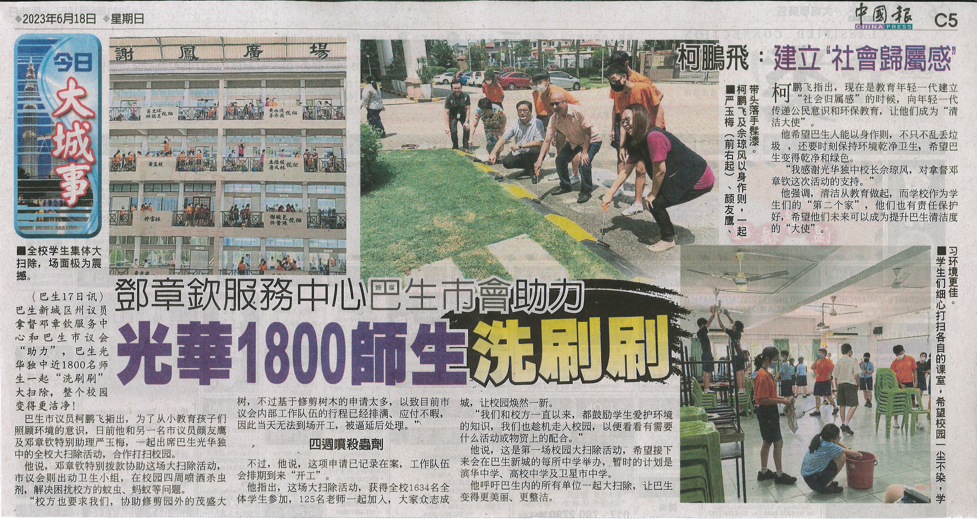 邓章钦服务中心和巴生市会助力,本校1800师生共同洗刷校园