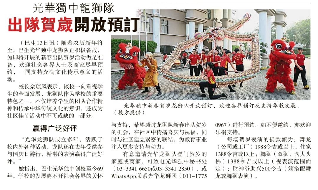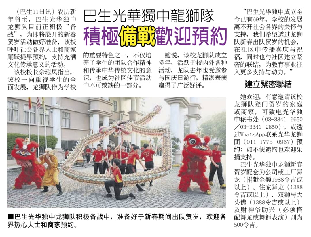 巴生光華獨中龍狮陔積極備戰迎預約