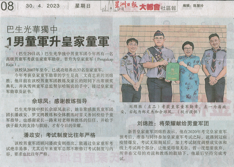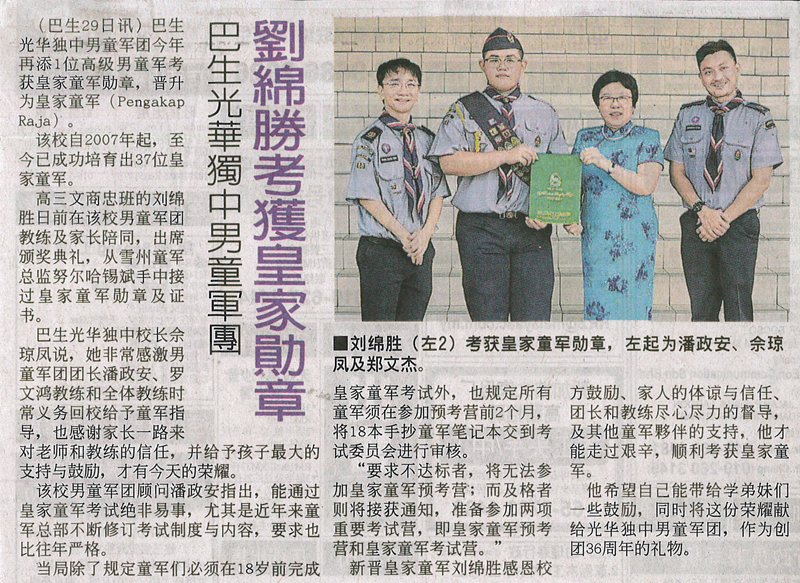 刘锦胜荣获皇家童军勋章,本校男童军团再添荣耀